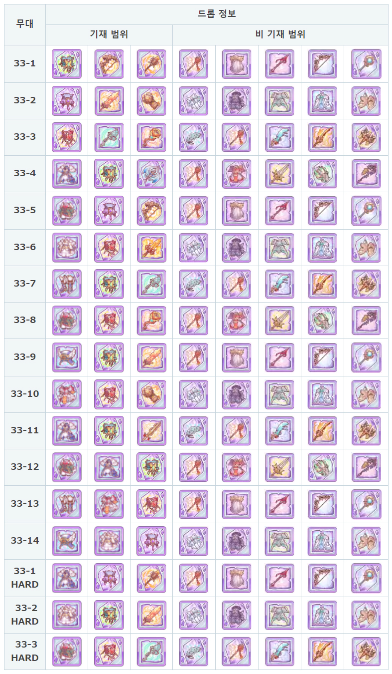 프린세스커넥트의 33 지역 장비 아이템 드랍 테이블입니다. 31~33 지역까지 비기재 범위의 보라색 장비가 같습니다. 참고하시고 효율적이게 파밍하시기 바랍니다.
