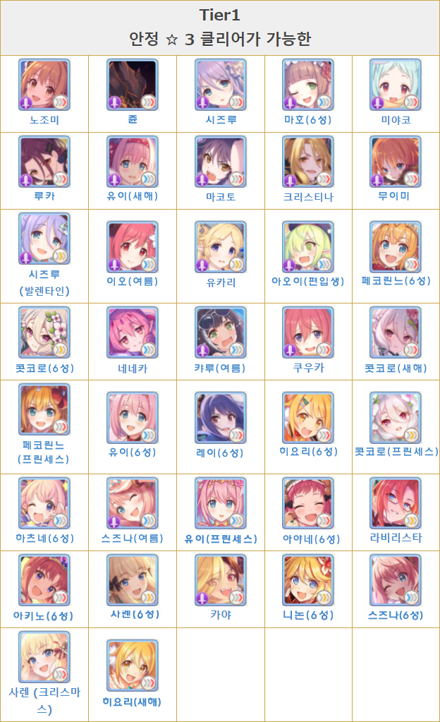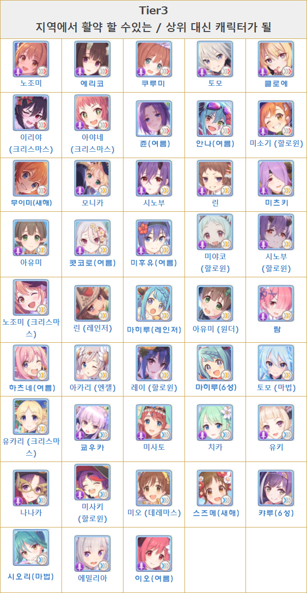 프린세스 커넥트 리다이브의 2020년 3월 티어 등급표가 업데이트 되었습니다. 최신 티어 등급표를 참고하실분은 아래의 링크를 통해 확인해주시기 바랍니다. 프린세스 커넥트 최신 등급표 / 전