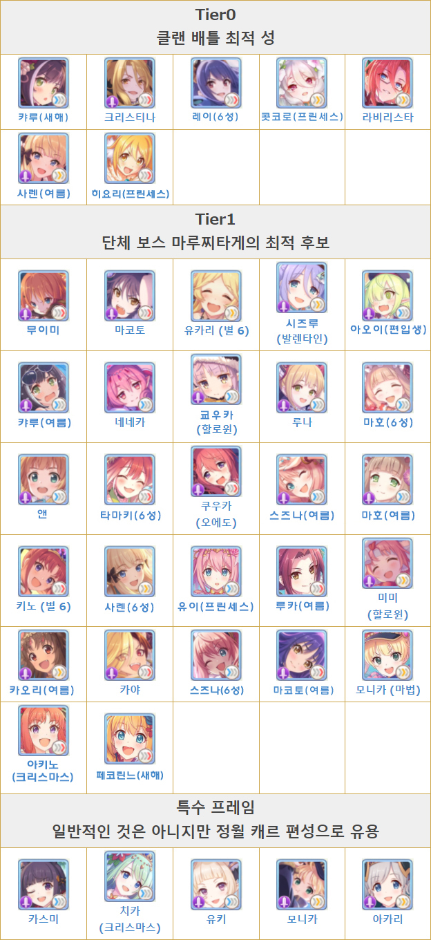 2021년 1월 프린세스 커넥트 티어 등급표 / 전 캐릭터, 퀘스트, 아레나, 클랜전 프리코네 프커넥