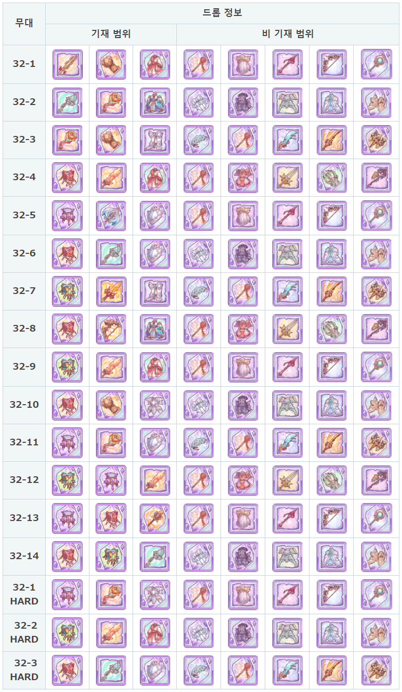 프린세스커넥트의 32 지역 장비 아이템 드랍 테이블입니다. 31~33 지역까지 비기재 범위의 보라색 장비가 같습니다. 참고하시고 효율적이게 파밍하시기 바랍니다.